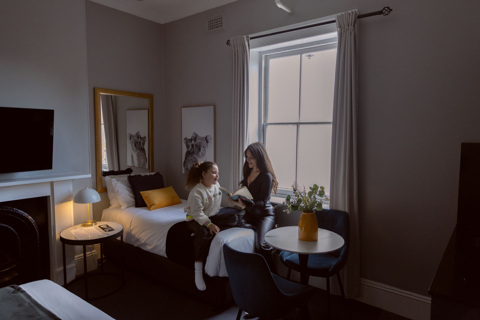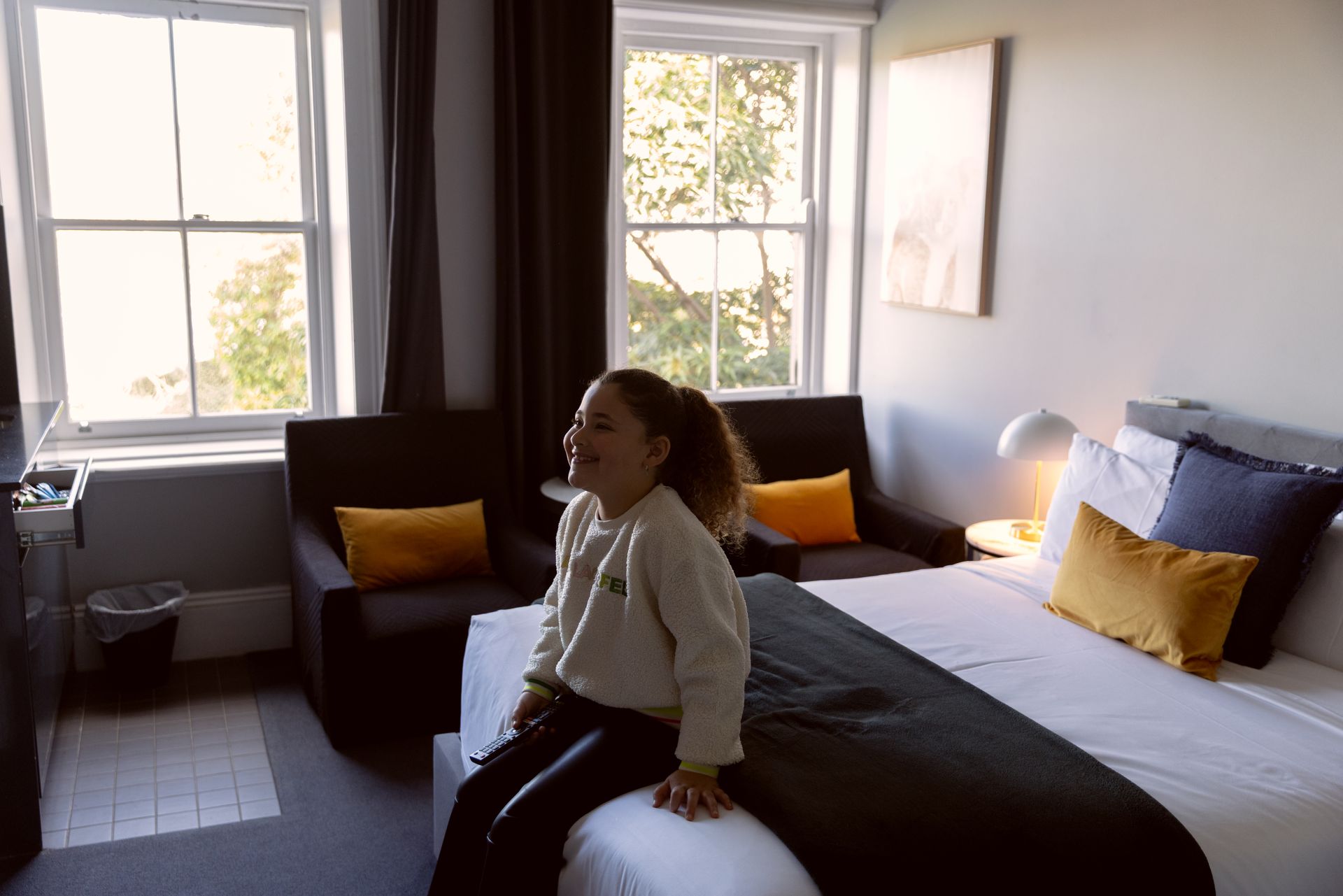 Introducing our spacious 35-square-meter family room with a double bed, two single beds, a sofa and a view of Bayswater Road. This room is bathed in natural light through six large windows, creating a bright and welcoming atmosphere.