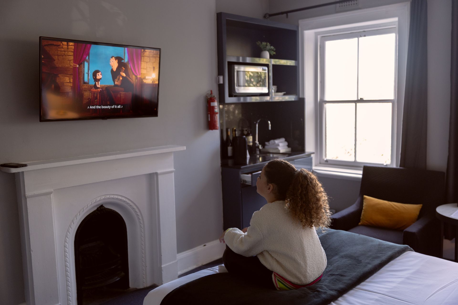 The room boasts two large windows with leafy views, allowing natural light to fill the space and providing a beautiful outlook onto Bayswater Road. For your convenience, the room also includes a kitchenette with a microwave and mini bar fridge.