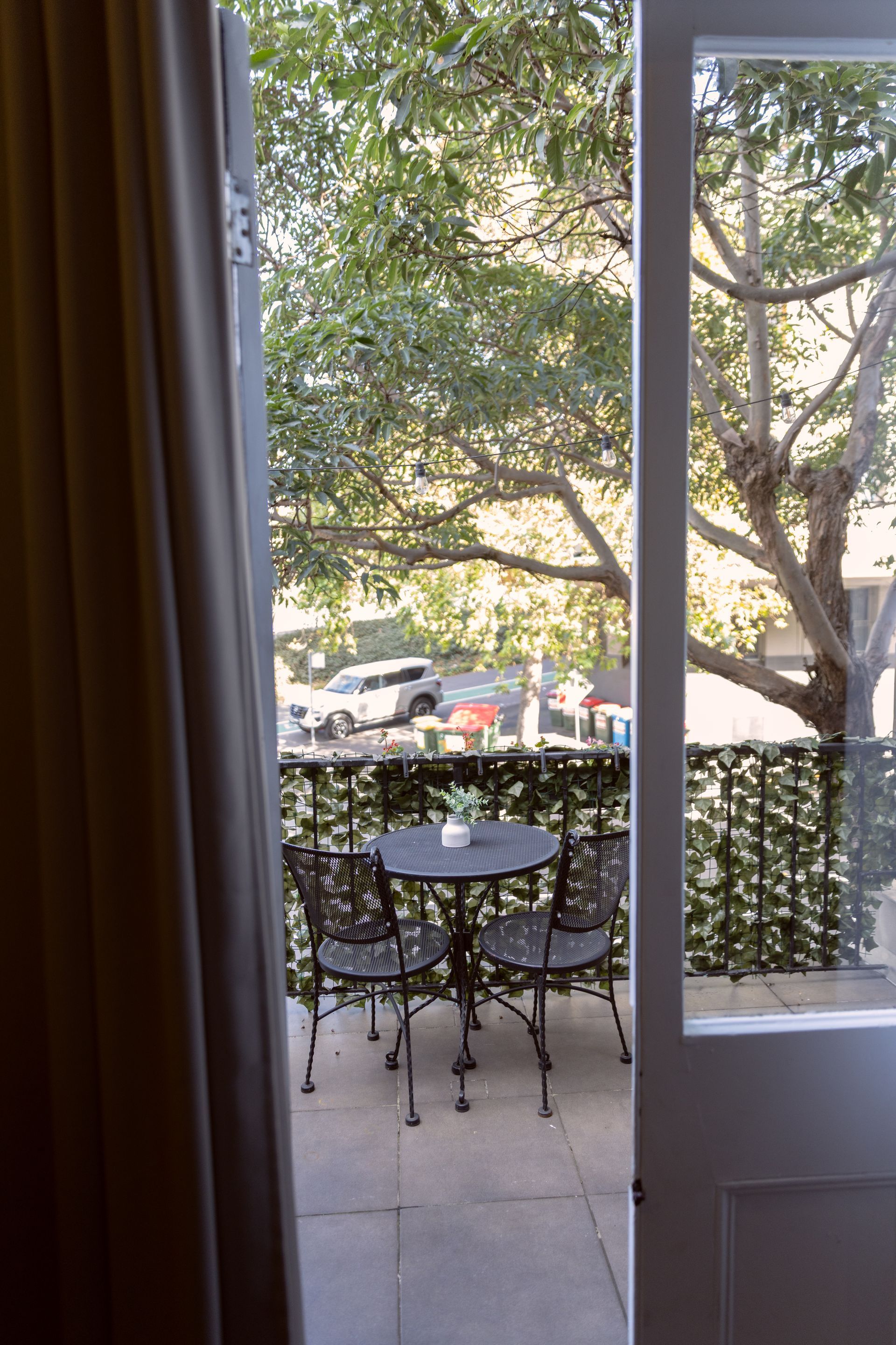 Enjoy the spacious comfort and leafy views of our Large Terrace Double with Single Bed. This room features French door floor-to-ceiling windows that flood the space with natural light, and a private terrace with a dining table for two, overlooking Bayswater Road.