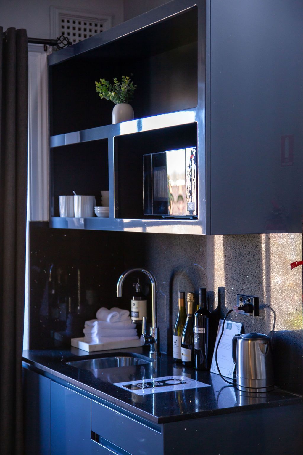 The well-appointed and maintained bathroom is external to the room but conveniently located nearby. Take advantage of the room's kitchenette with a microwave, kettle, plates, and cutlery for preparing small meals and snacks